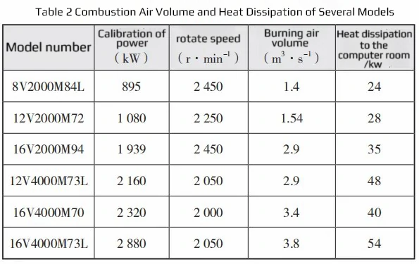 Table 2 presents the combustion air volumes for several models. When designing the engine (especially for the design where the combustion air is drawn from the engine room), special attention should be paid to this.