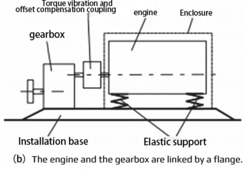 5. Unit Installation The MTU2000/4000 engine is a high-speed machine. To reduce the vibration of the unit, elastic supports must be used. These elastic supports are equipped with rubber elastic elements of appropriate stiffness. At this point, the connection between the gearbox and the engine, as well as the installation on the base, usually adopts the following two methods [3], as shown in Figure 4.